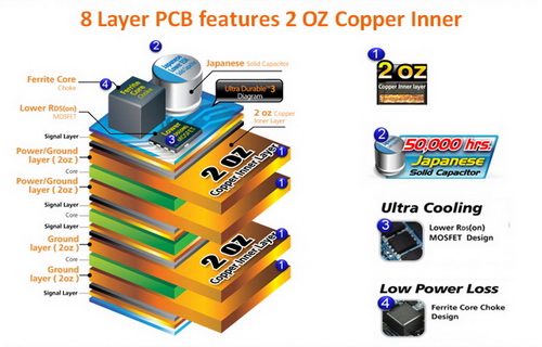 . Ultra Durable3 ±â¼ú - 4Ãþ 2oz Copper(±¸¸®)·¹ÀÌ¾î Æ÷ÇÔ 8·¹À̾î PCB - 50,000Hr Japanese ¼Ö¸®µå ijÆÐ½ÃÅÍ Àû¿ë - Àú-¹ß¿ Lower RDS(on) ¸ð½ºÆê - °í-¿¡³ÊÁö È¿À²ÀÇ Ferrite core ÃÝÅ©