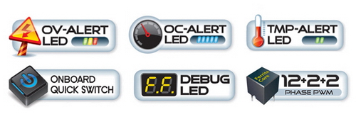 . ¿Â-º¸µå Äü½ºÀ§Ä¡ (1 x ¸®¼Â, 1 x ÆÄ¿ö, 1 x CMOS Å©¸®¾î) . Overvoltage LED (CPU, Memory, NB, SB Àü¾Ð »óÅ ǥ½Ã) . Overclock LED (CPU ¿À¹öŬ·° »óÅ ǥ½Ã) . Temp indicator LED (CPU, NB ¿Âµµ Ç¥½Ã) . Debug LED